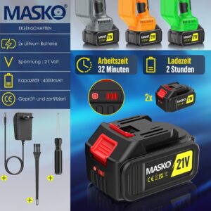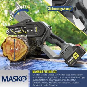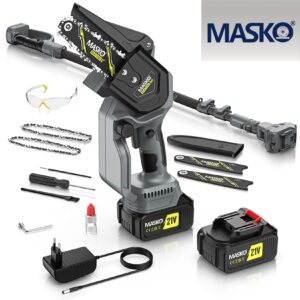 MASKO Mini Chainsaw 800W motor, two 4000mAh batteries, safety lock, splash guard, low operating noise, overheating and overtemperature protection, high-strength saw blade, oil injection device, overload protection and 32 minutes working time